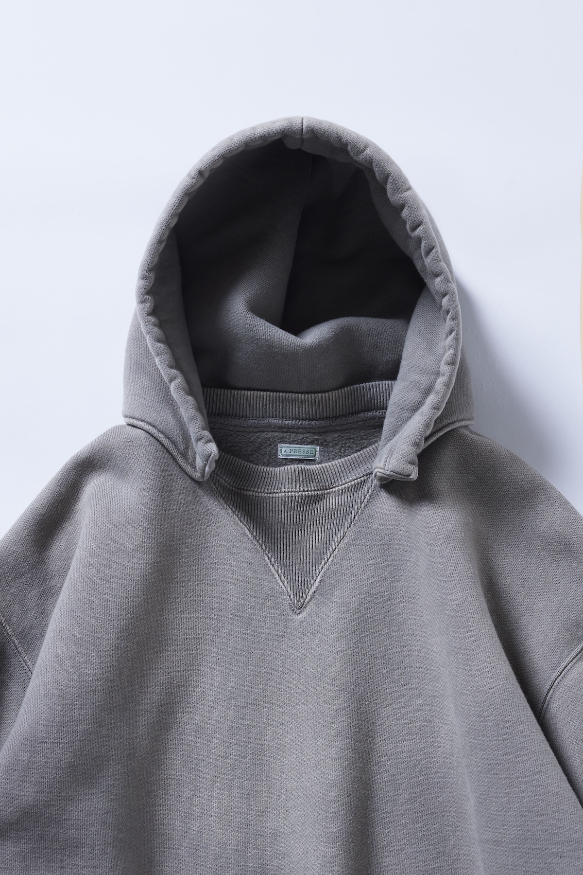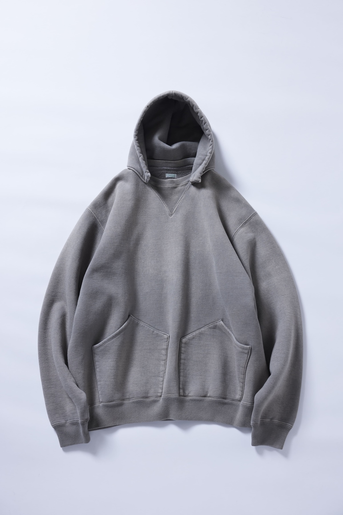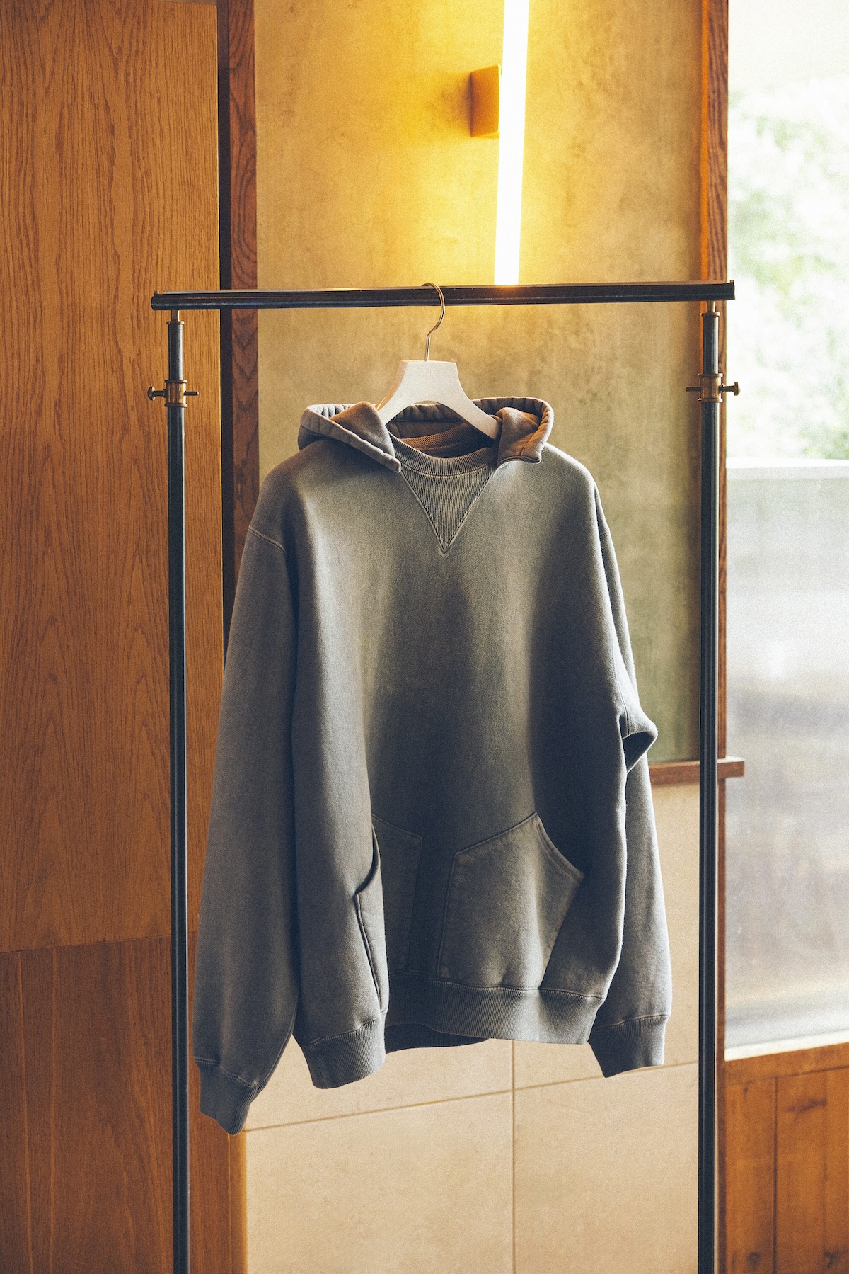 グレーカラーのボディに、色むらやダメージ感を一枚ごとに手仕事で施した「Vintage Attached Hood Sweat Parka」。薄く伸びたリブや歪んだポケットや小さなフードなど、時を経て崩れたシルエットをあえて再構築した後付けフーディのディテールにも注目したい。