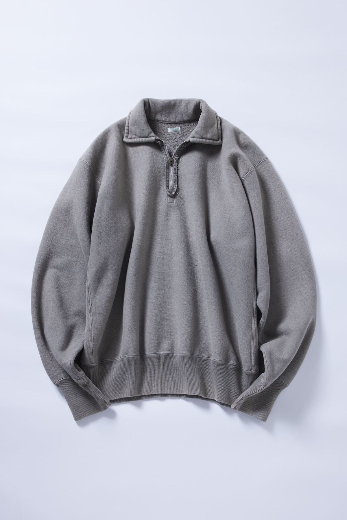 「Vintage Half Zip Sweat Shirt」は、ヴィンテージの雰囲気を踏襲した縫製仕様で忠実に再現。短丈で程よいボリュームを持つ袖、肩ハギのない丸みのあるフォルムが特徴で、裏起毛にはヴィンテージ糸を解析した半起毛生地を採用。経年変化による風合いを職人の手作業で丁寧に表現した一品だ。