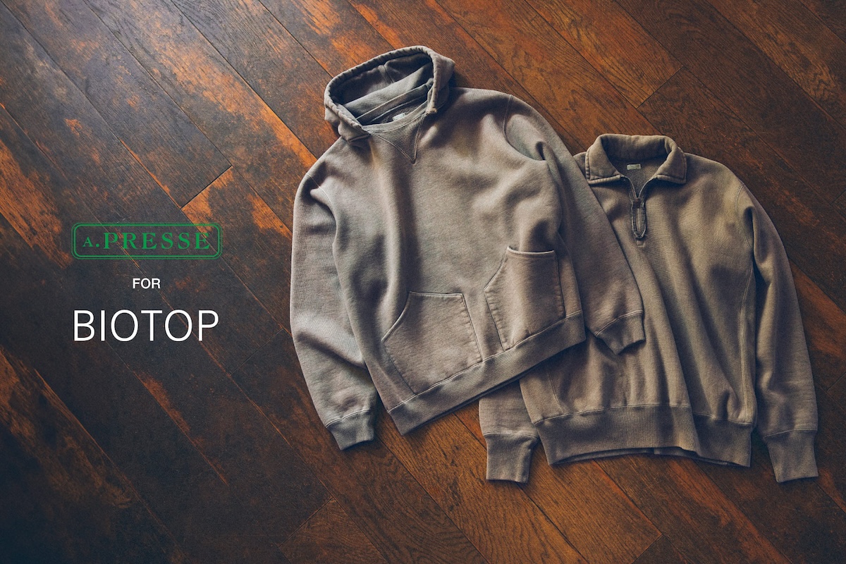 BIOTOP(ビオトープ)が、A.PRESSE(アプレッセ)との別注スウェット2型を2025年10月11日(土)より、BIOTOP各店(白金台・大阪・福岡・神戸)と公式オンラインストアで発売する。