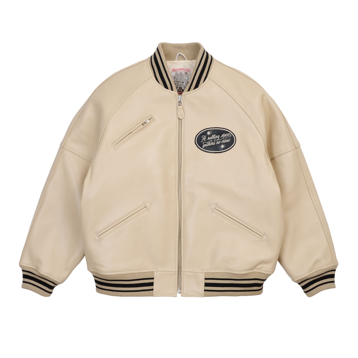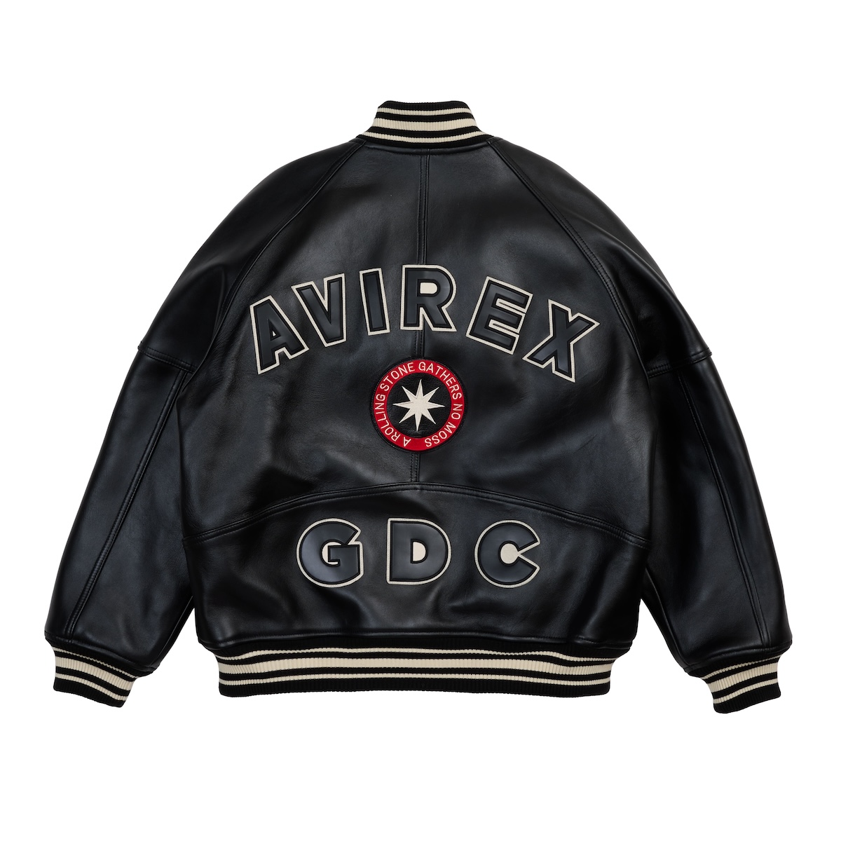 バーシティジャケットを贅沢なオールレザー仕様で仕立てたスタジアムジャンパーには、胸元に“STA”モチーフのエンブレムパッチ、背面にAVIREX × GDC のダブルネームを配置。経年変化がスタイルに深みを加える、ブラック、オフホワイト、ワインレッドの3色で展開される。