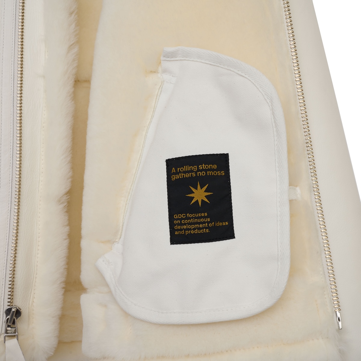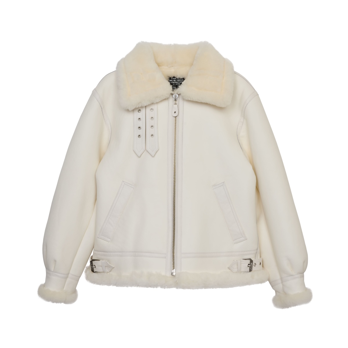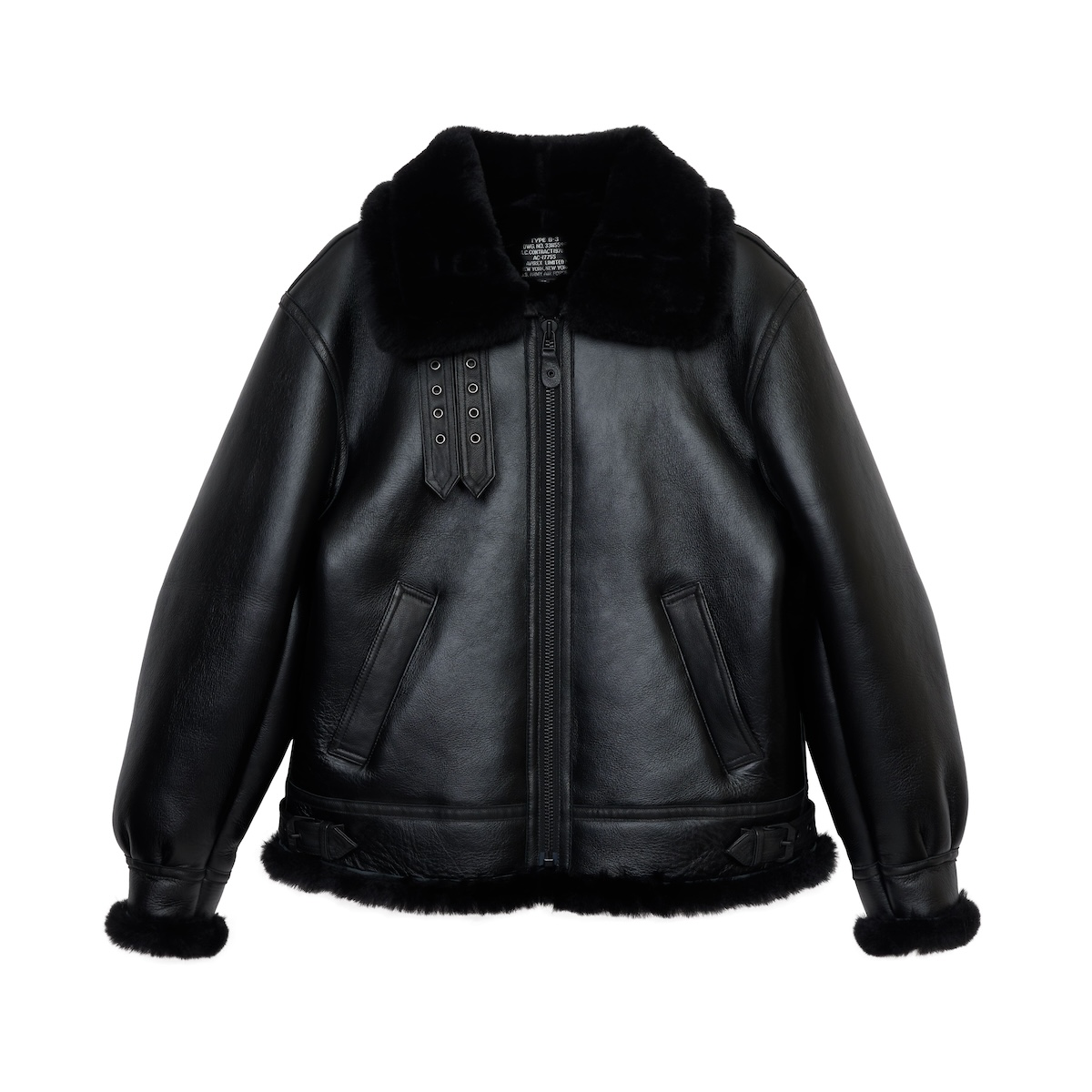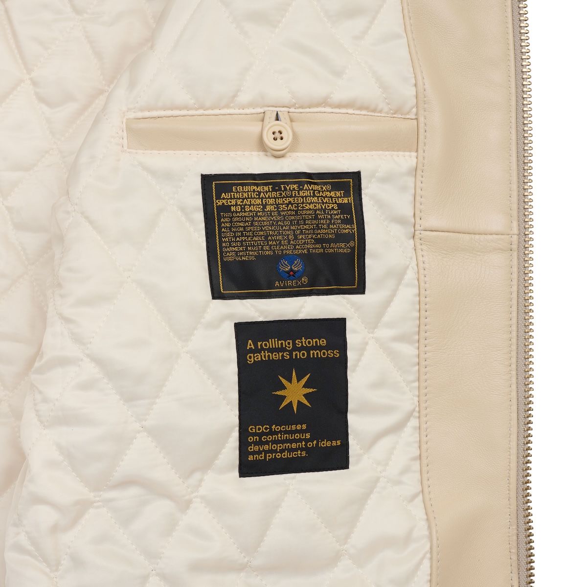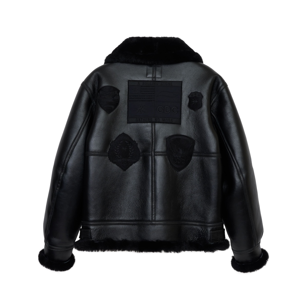 1930年代のフライトジャケットをベースに、GDCの視点で再構築したB-3は、厚手のシープスキンによる高い保温性と防風性を確保。背面には今回のコラボレーションのためにデザインされたGDCの八芒星“STA”モチーフと「A rolling gathers no moss」のスローガンを配している。