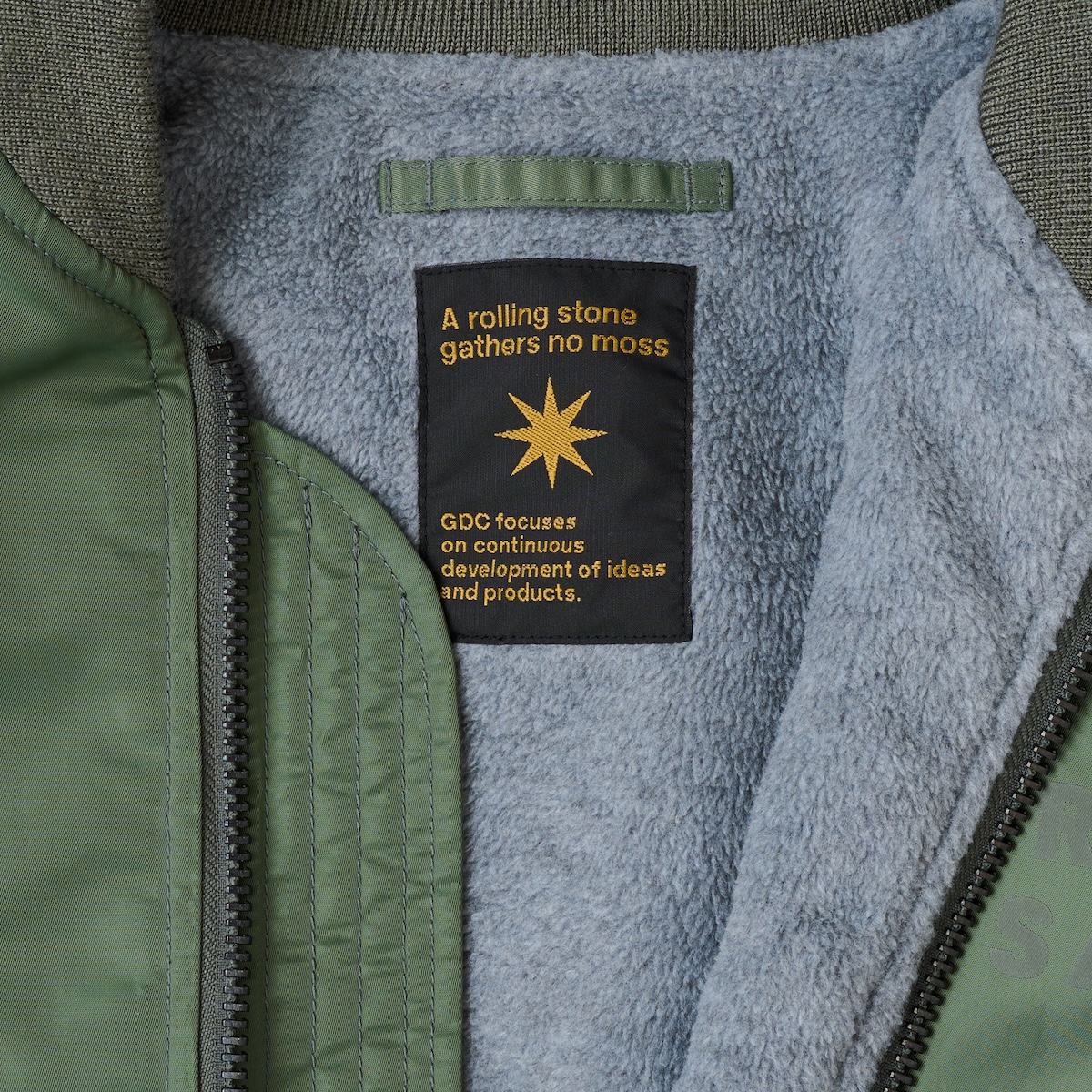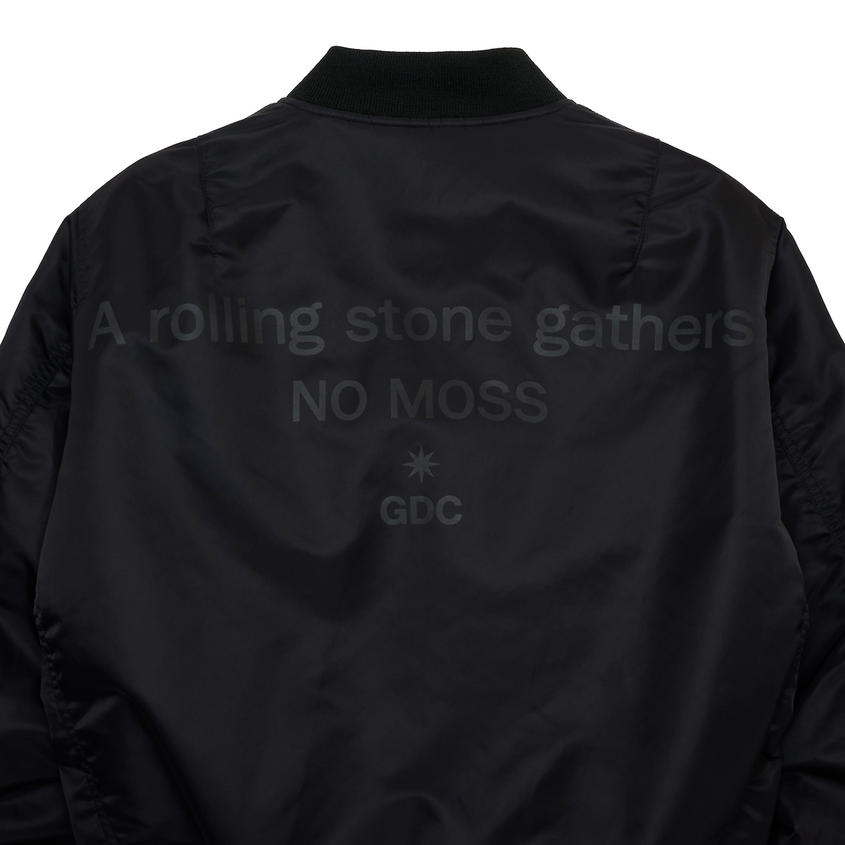 米軍のフライトジャケットベースに、ヘビーナイロンツイル素材と中綿構造で現代的に解釈したMA-1では、リバーシブル仕様の裏地にはフリース素材を採用し、実用性と遊び心を兼ね備えた一着に仕上げた。背面には同色でさりげなく「A rolling gathers no moss」を刺繍で施し、GDCらしいウィットさを添えている。