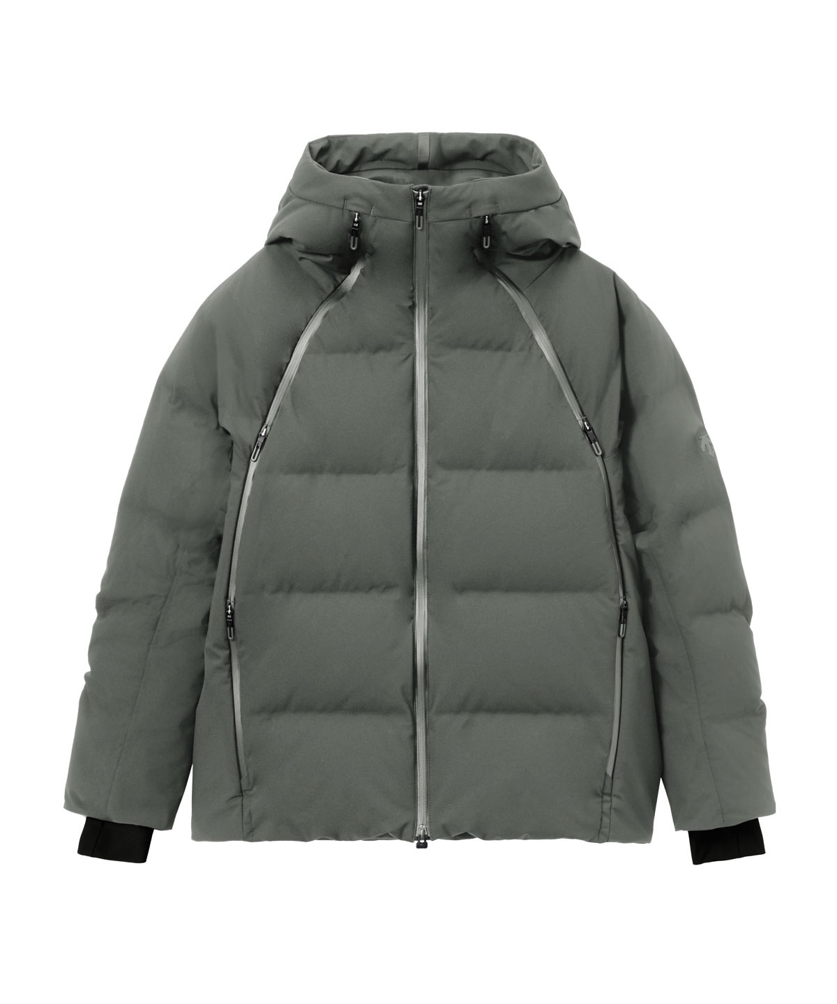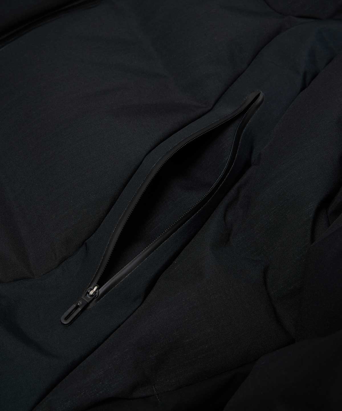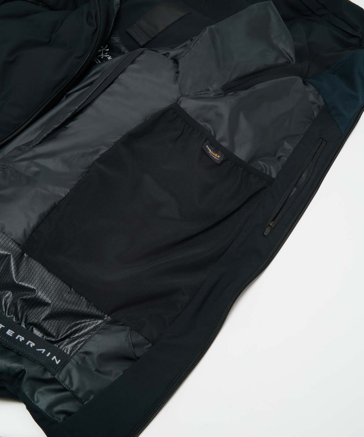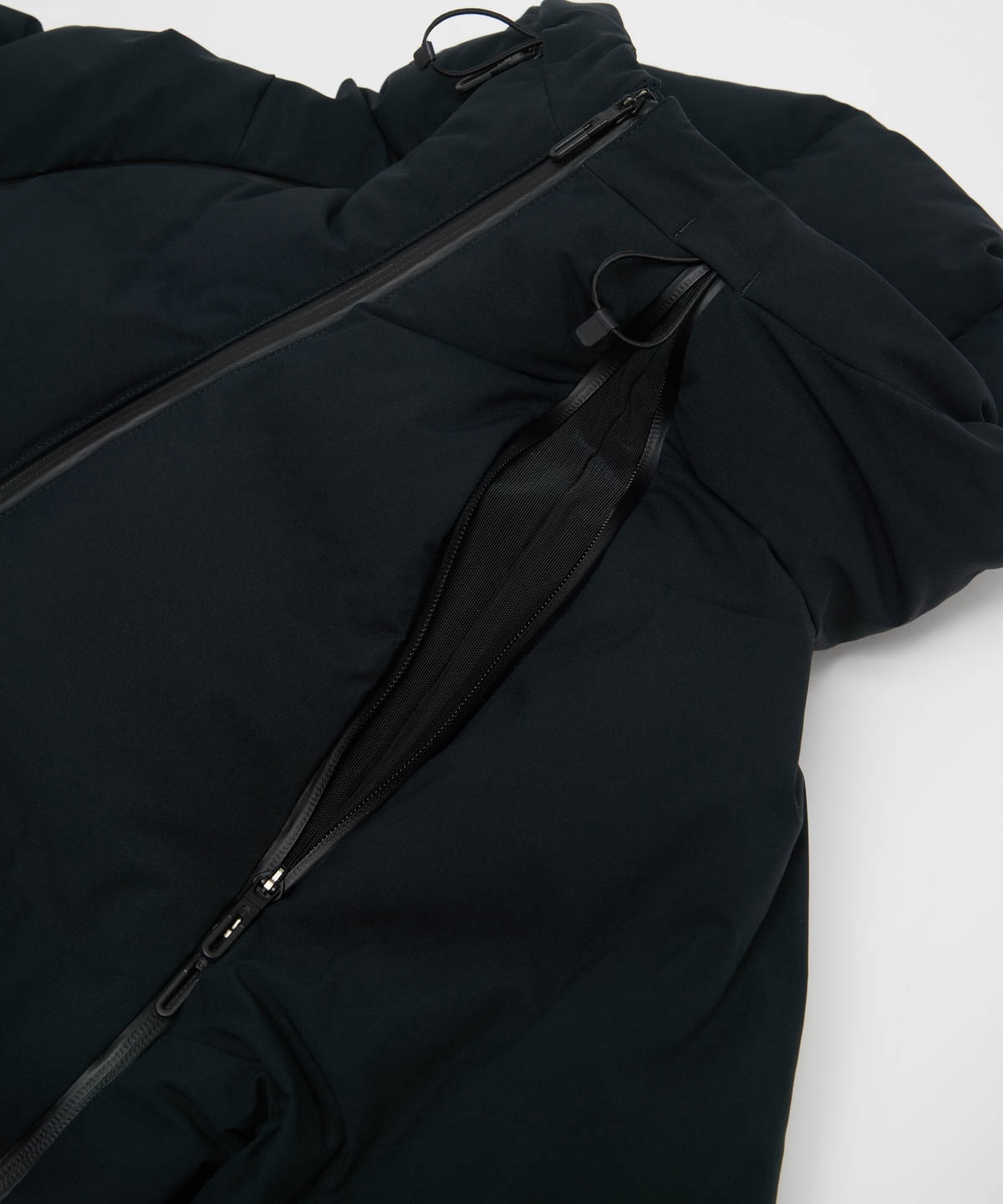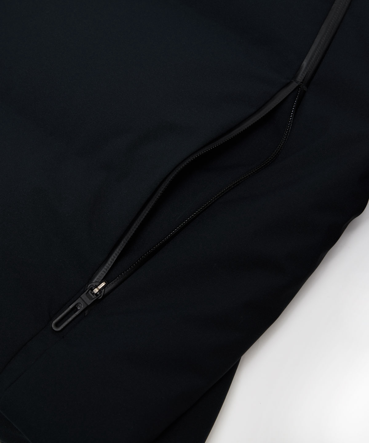 左右のファスナーは、ベンチレーション、ハンドウォーマー、ポケットの3機能を集約し、ミニマルながら高い合理性を実現。表地には耐久性に優れるCORDURA®ストレッチ素材を採用し、熱接着ノンキルト加工とシームテープ加工によって高い耐水性を確保している。