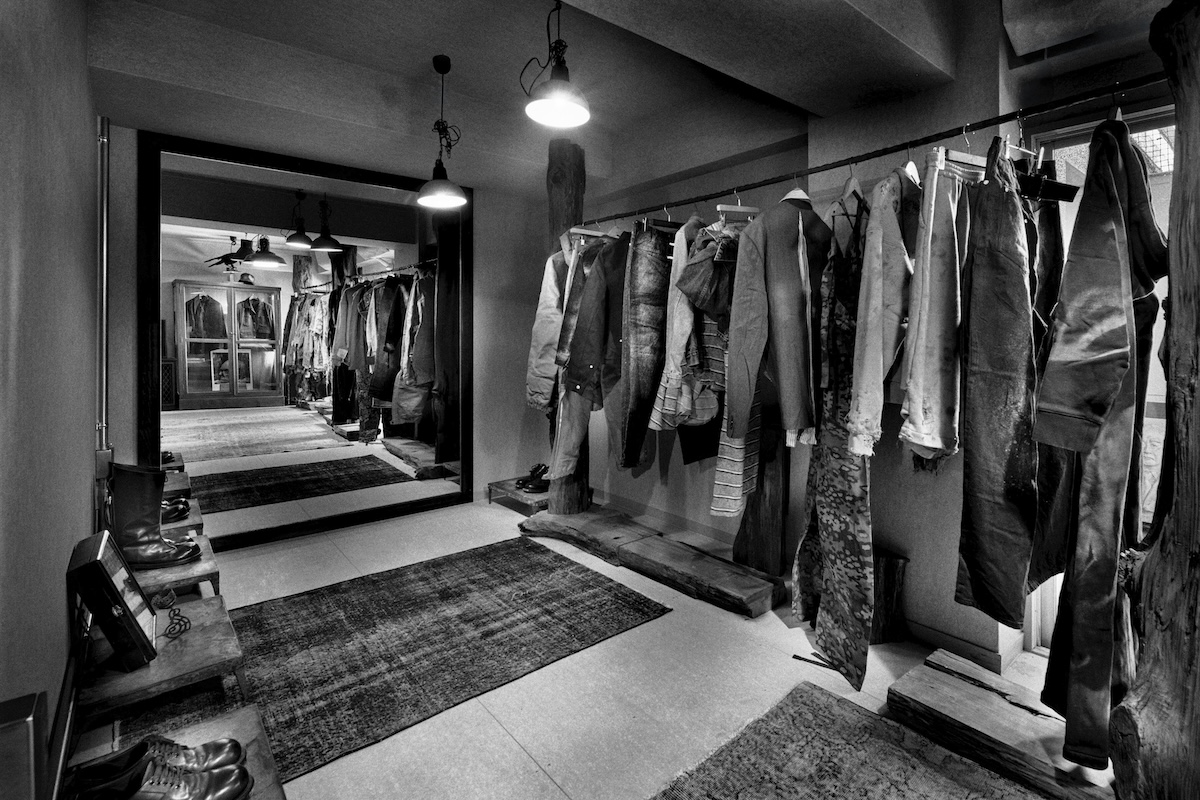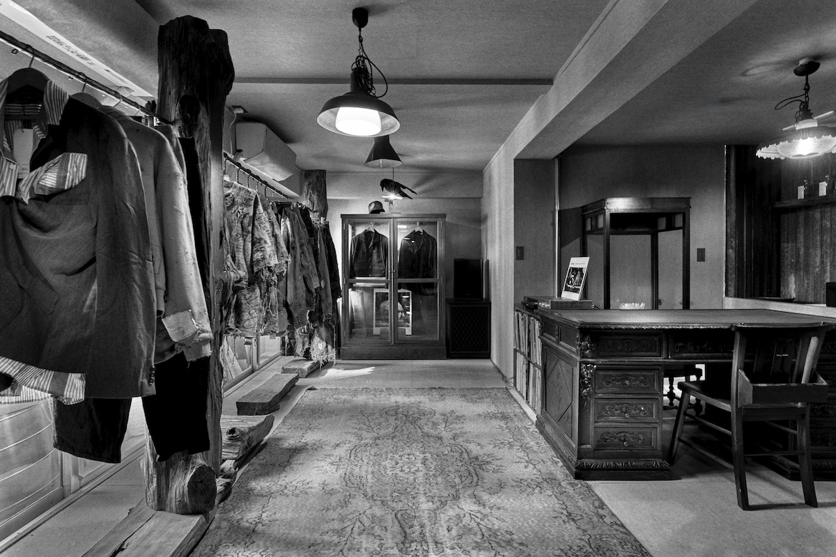 内装は職人と共に制作した神代杉のラックをはじめ、鍛冶屋と共同制作した手打ちのハンガーや鉄筋の物干し竿、西洋・東洋のデザイナーが蒐集したアンティークや古道具などで構成。