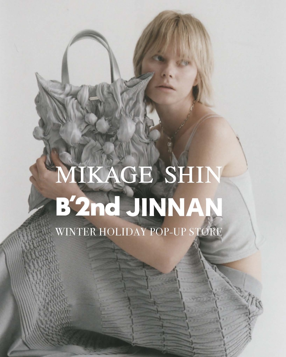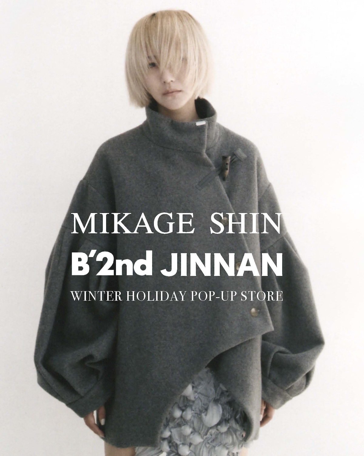 ジェンダーレスなコレクションを展開するファッションブランドのMIKAGE SHIN(ミカゲ シン)が、「B’2nd(ビーセカンド) 神南店」で、2025年12月19日(金)〜31日(日)までホリデーポップアップストアを開催する。