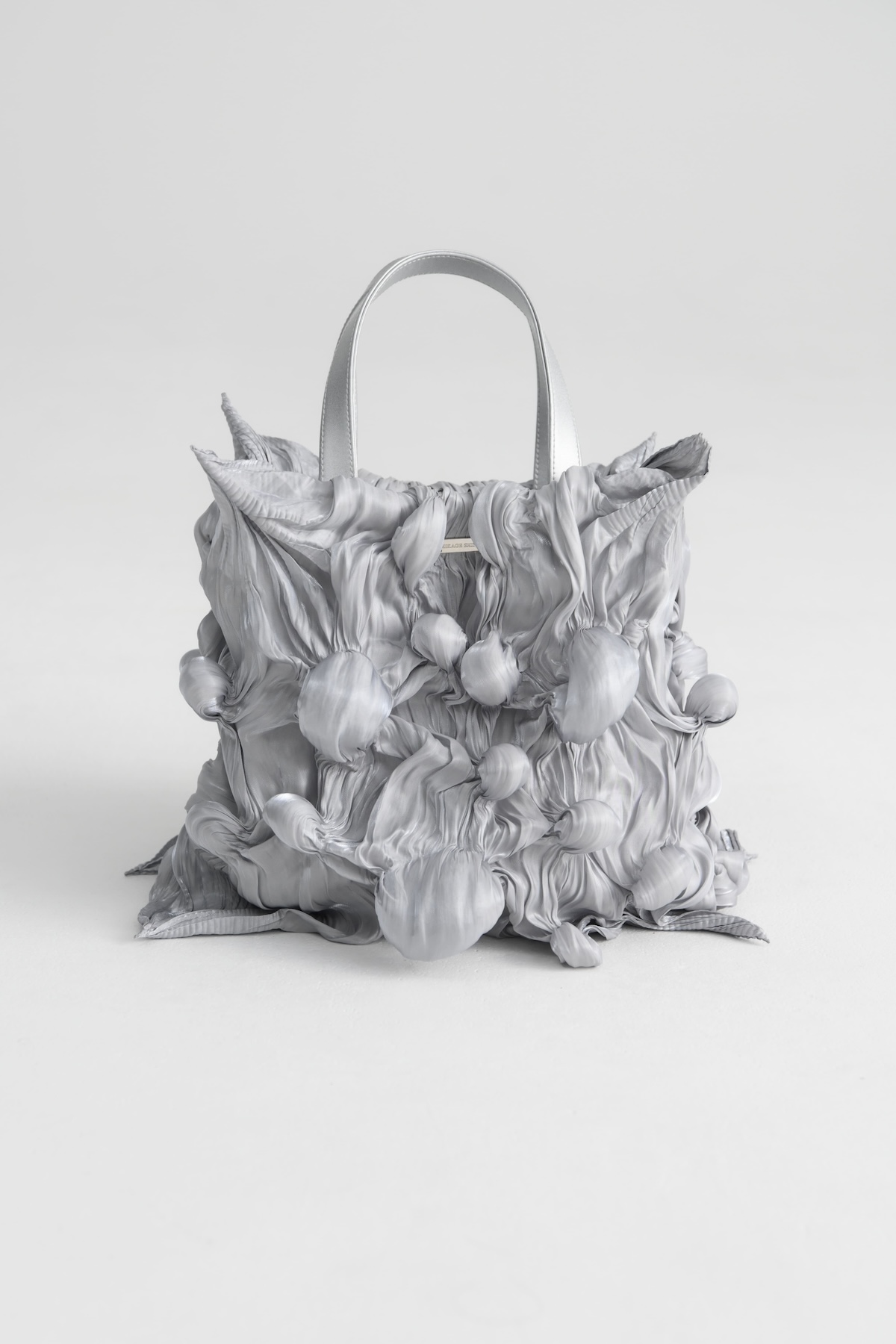 本ポップアップでは、MIKAGE SHINの公式オンラインストアで今月リリースされた新作「Spiky Shibori Liquid Bag」が、ブランド主催のポップアップ以外では初登場となる。