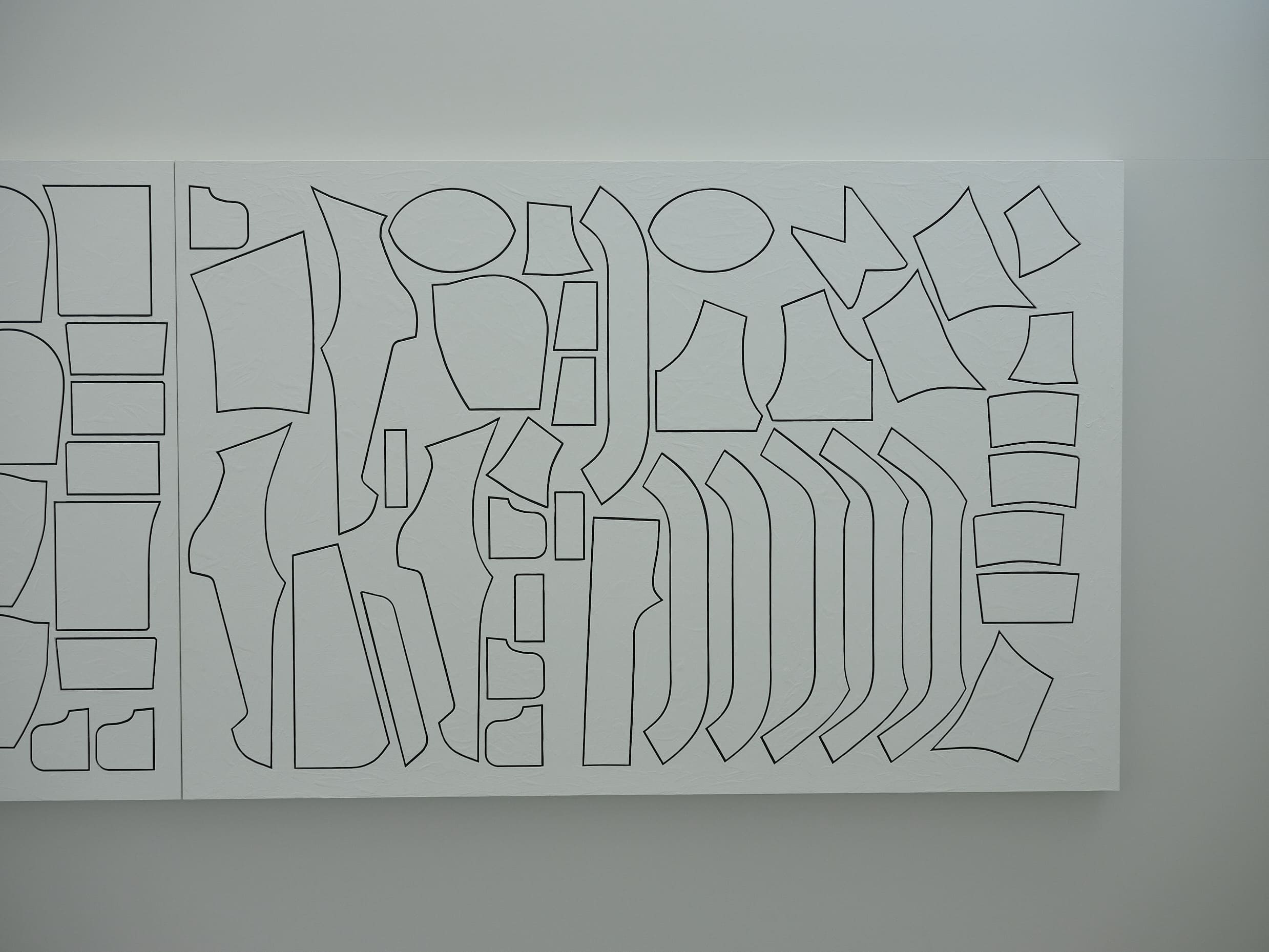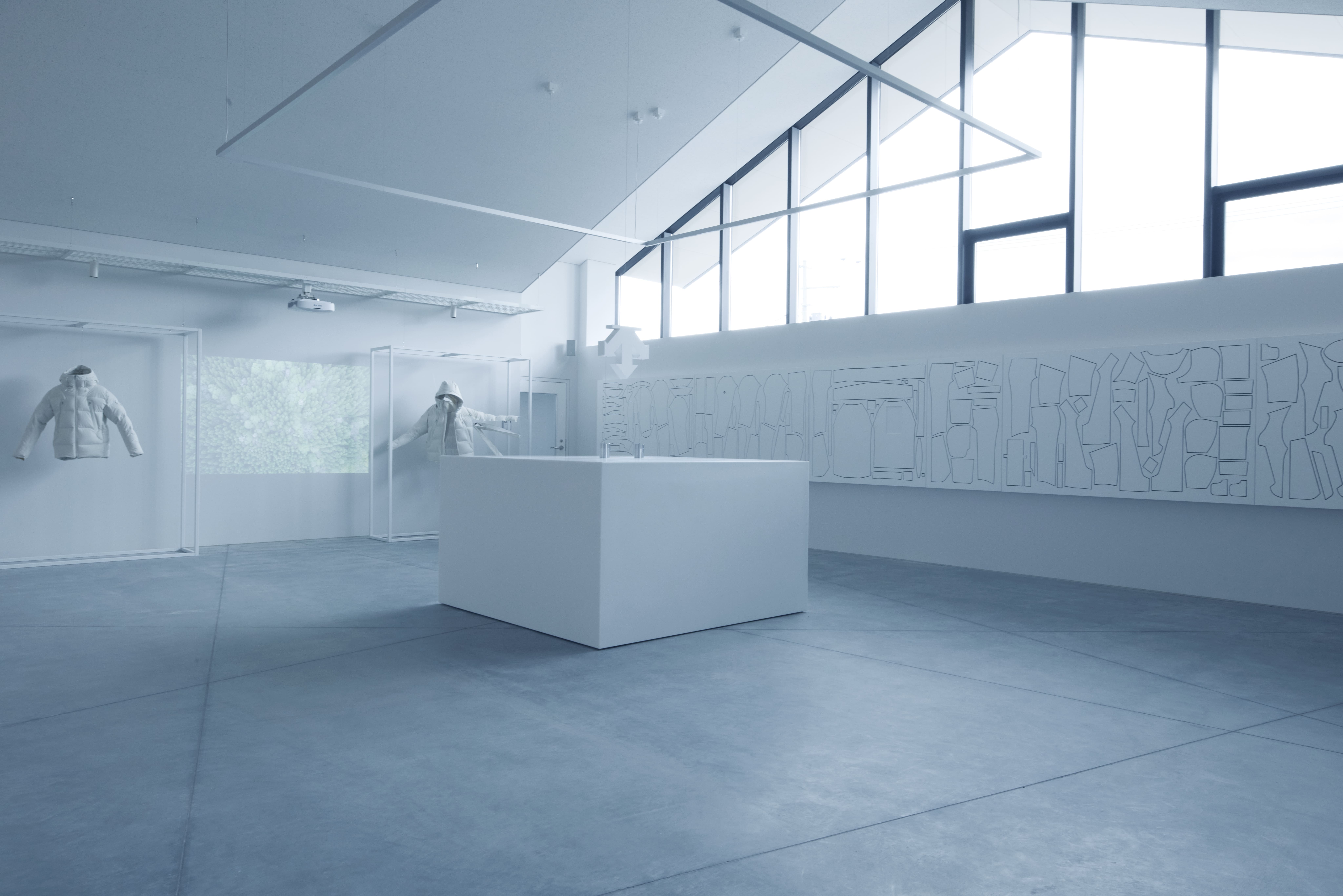 まずエントランスに入ると、約10メートルにも及ぶパターンボードが出迎える。水沢ダウンの原点であり最人気モデル「MOUNTAINEER(マウンテニア)」Sサイズ1着分の全裁断パーツを配置したこのボードは、工程数の多さや構造の複雑さ、そして多くの人の手を経てプロダクトが完成していく過程を視覚的に伝える。訪れる人への演出であると同時に、日々ここで働く人々が自らの仕事に誇りを持つための“装置”でもあるという。