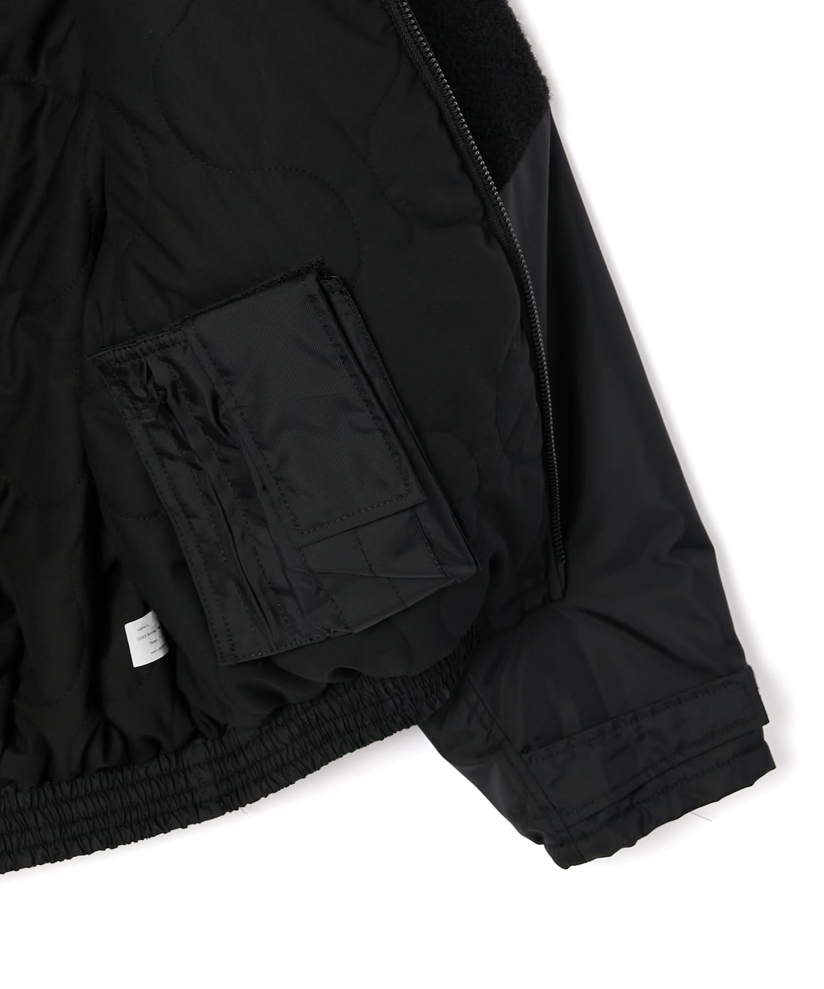 裏地には中綿入りのキルティングを施すことで防寒性を向上させ、袖口に配したベルクロが実用性を高めた。フロントポケット内側にはALPHA INDUSTRIESのタグを配置し、着脱式ベルクロ仕様のオリジナルミルスペックとシガレットポケットは、両腕または内ポケットへの装着が可能に。さらに、フードのタブと背面の2箇所にもオリジナルミルスペックを配し、プロダクトとしての完成度を高めている。