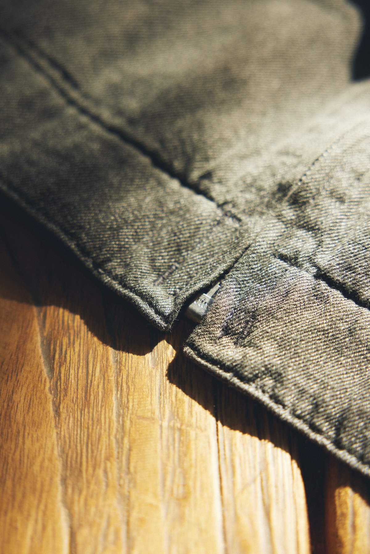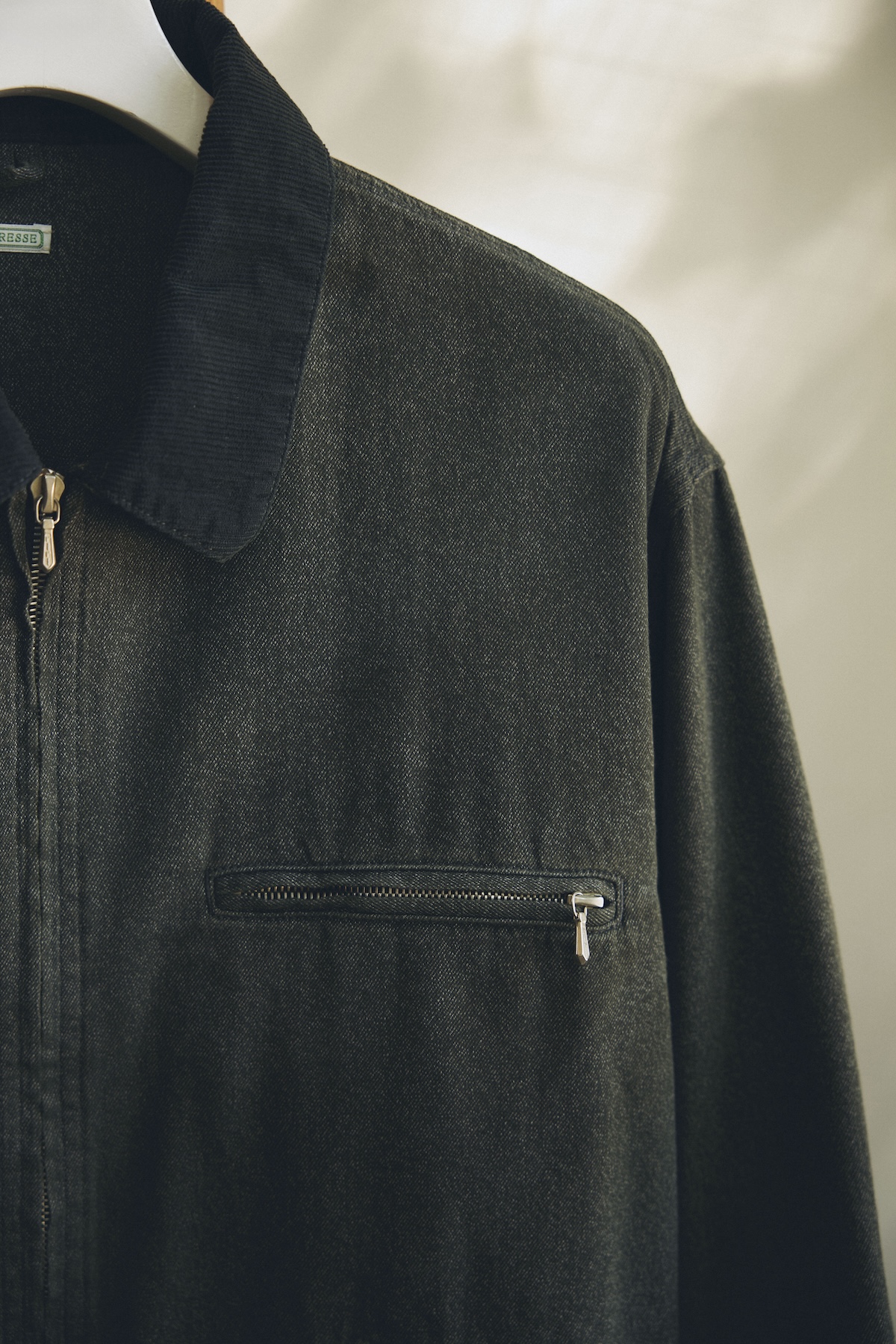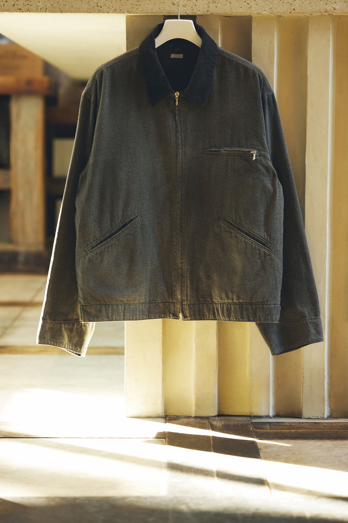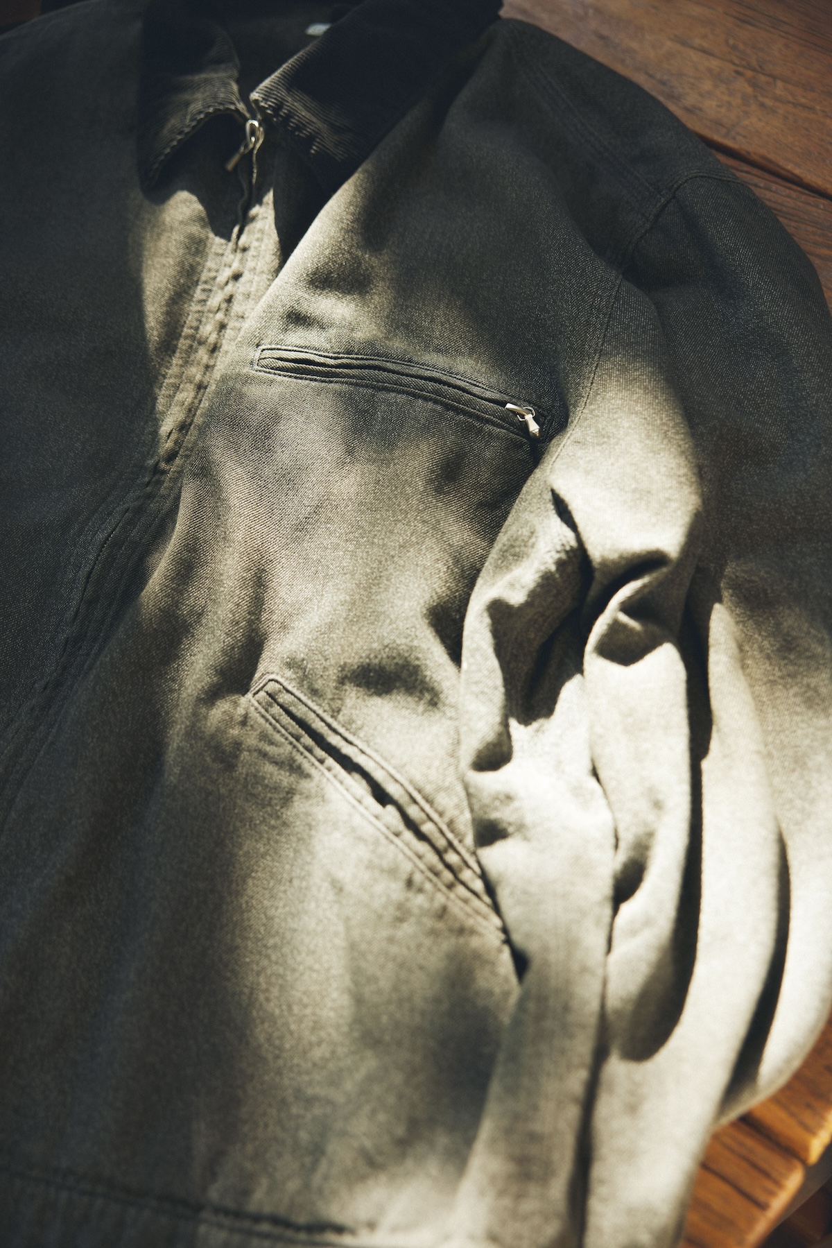 1990年代のデトロイトジャケットをベースにしたブルゾンは、肩のプリーツを排除することで、身頃裏だけの表地無双仕立てに肩傾斜をつけ、袖をナチュラルショルダーにアレンジ。高密度シャンブレーギャバジンを使用し、シミや汚れでムラのある絶妙な経年変化も感じさせる。