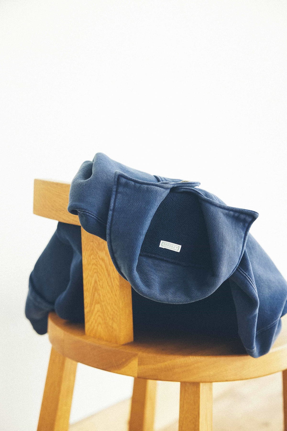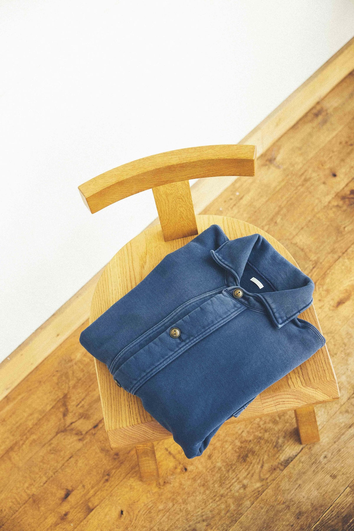 1930年代のヴィンテージのデザインを踏襲した、フロントスナップのカーディガンスウェットは、当時の短丈や適度な太さの袖を再現。裏起毛生地はベースのアイテムになった糸を解析し、ヴィンテージの経年変化を表現した半起毛も特徴的だ。職人による手作業で色むらやダメージも施しており、今回はインラインにはない別注カラーとしてネイビーがリリースされる。
