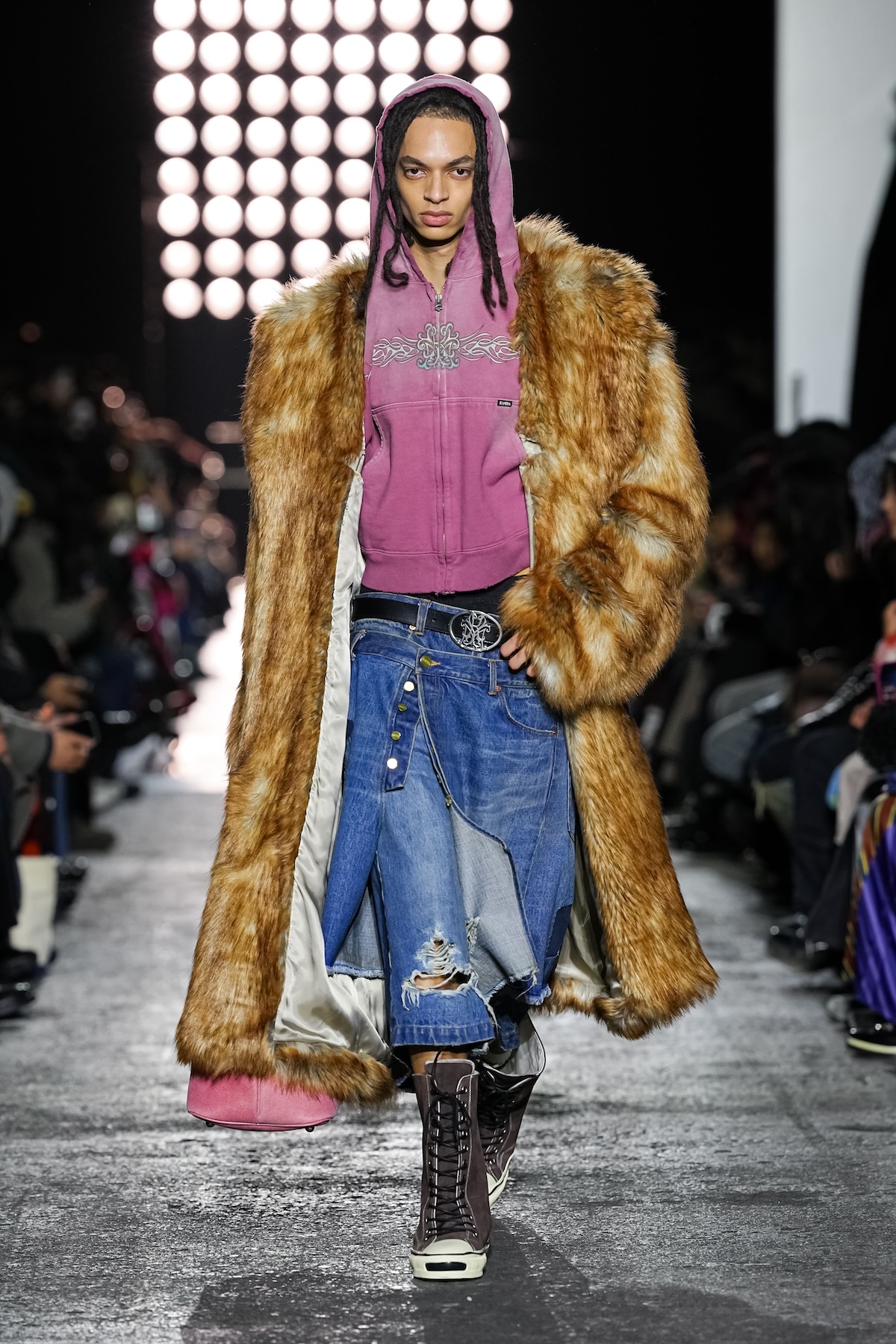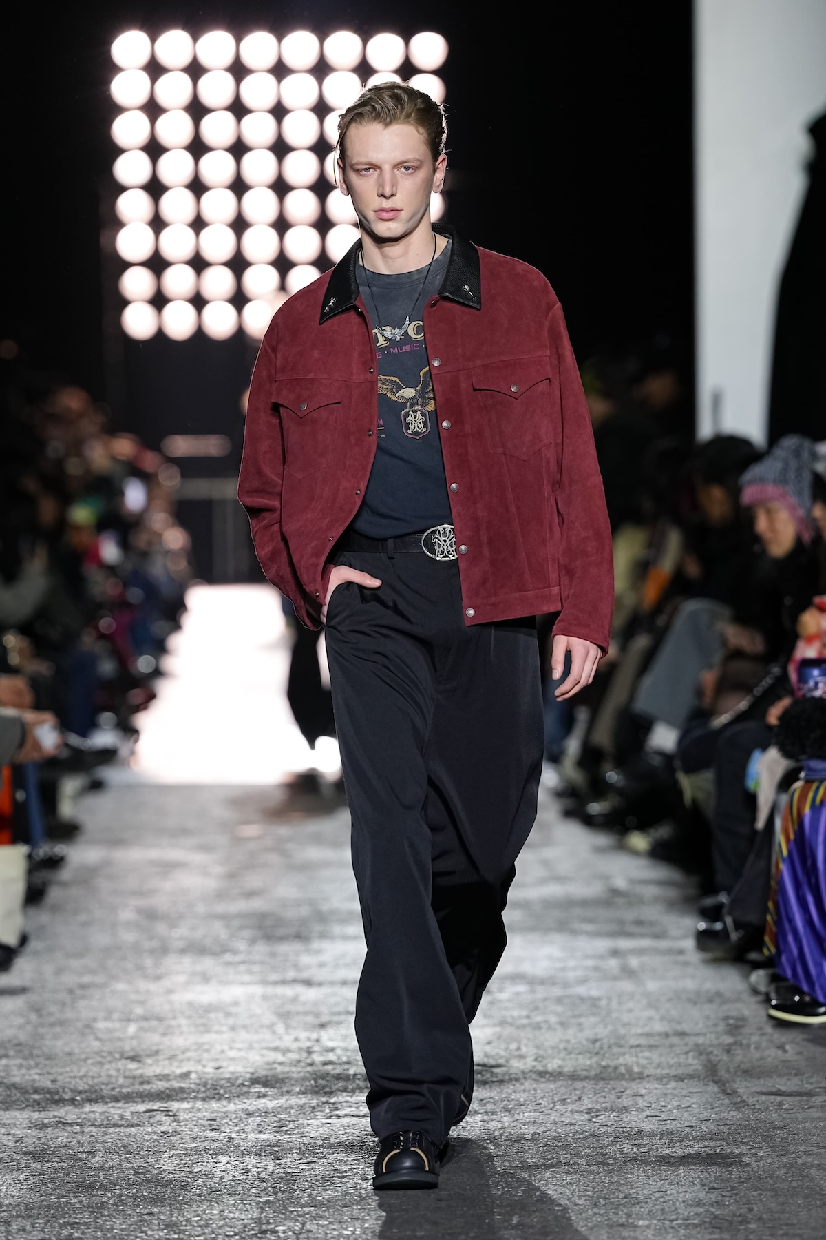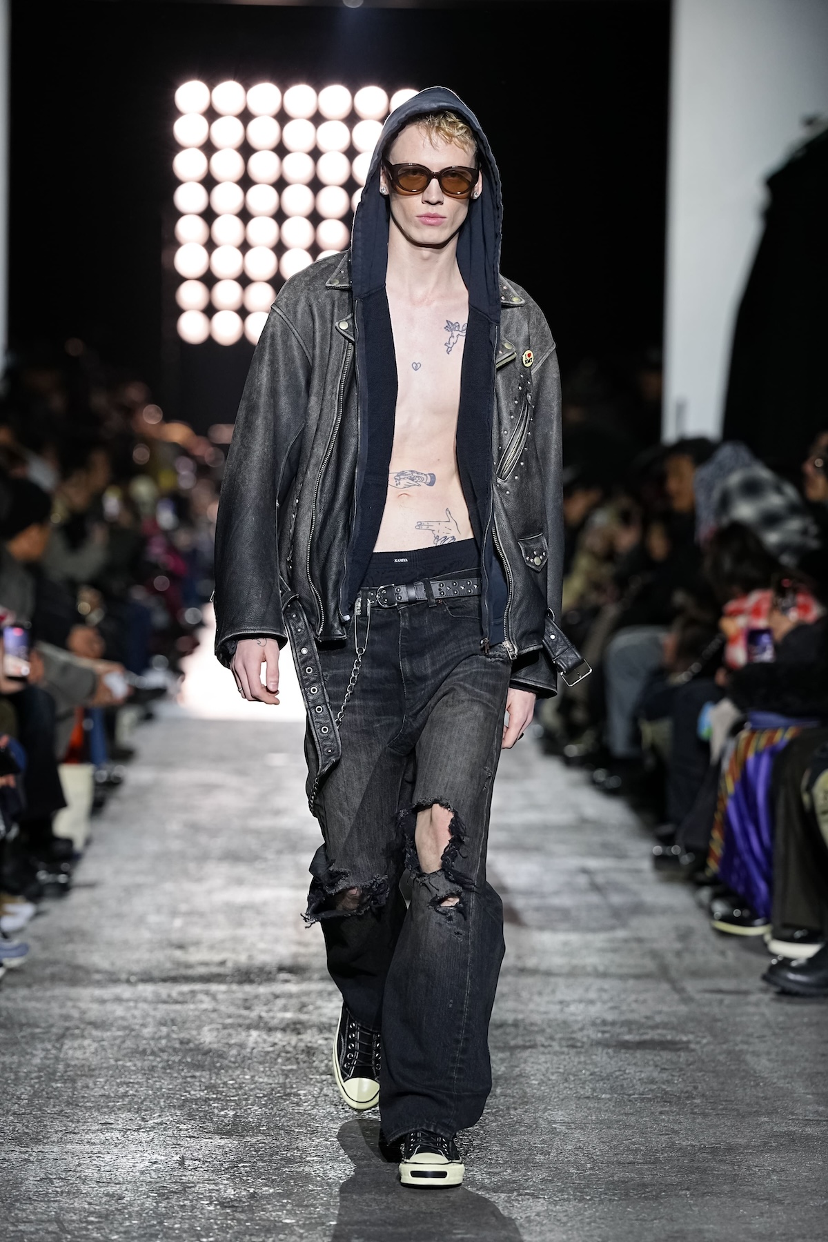 キーピースは、神谷康司デザイナーが2000年代に愛用していたというサルエルパンツを、フルレングスで再解釈し進化させたアイテム。トラウザースに仕立て、仕立ての良さがうかがえるテーラードジャケットと合わせるなど、新たなスタイリングを見せた。KAMIYAの特徴であるヴィンテージ加工のカジュアルアイテムのほか、シンプルな美しさが際立つレザーバッグ、襟元にあしらったメタル装飾、フェイクファーのロングコートなども印象的なコレクションだ。