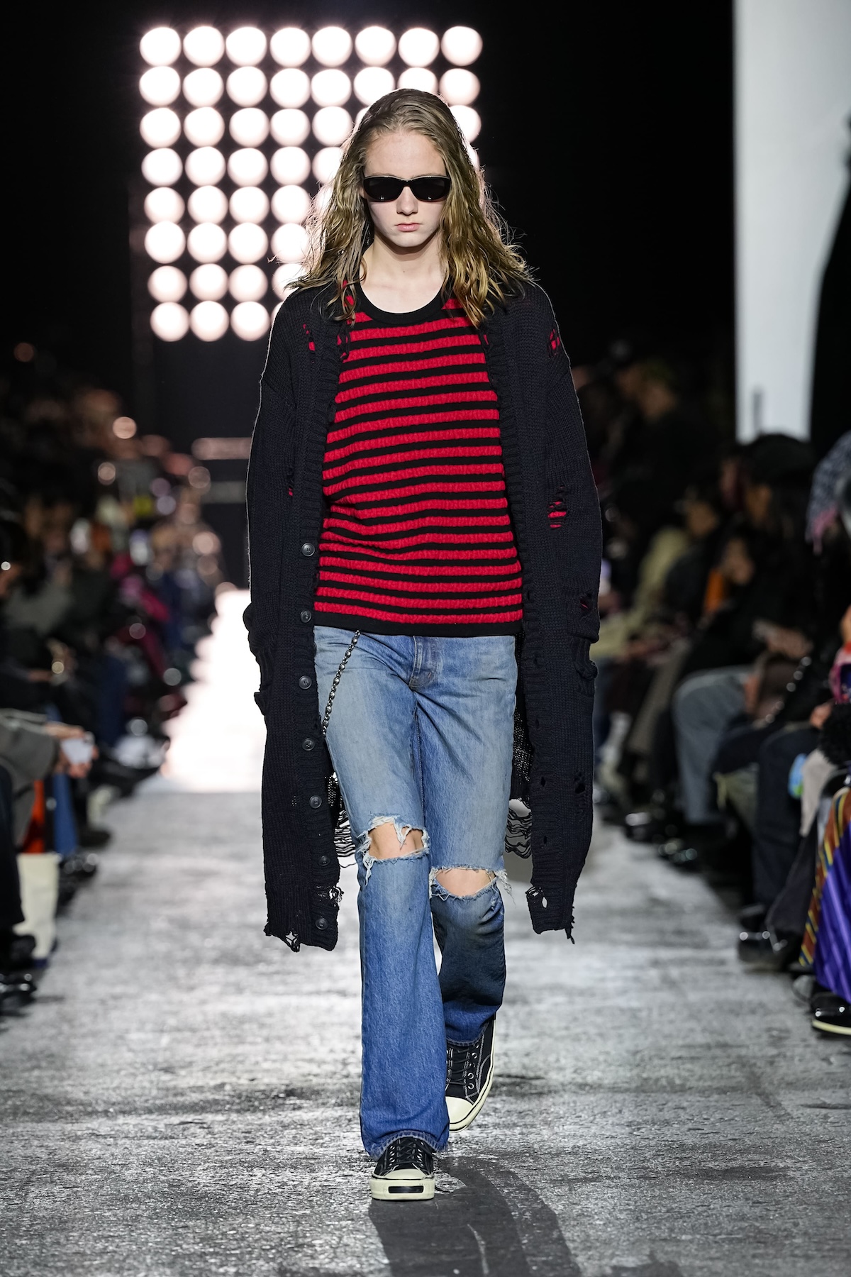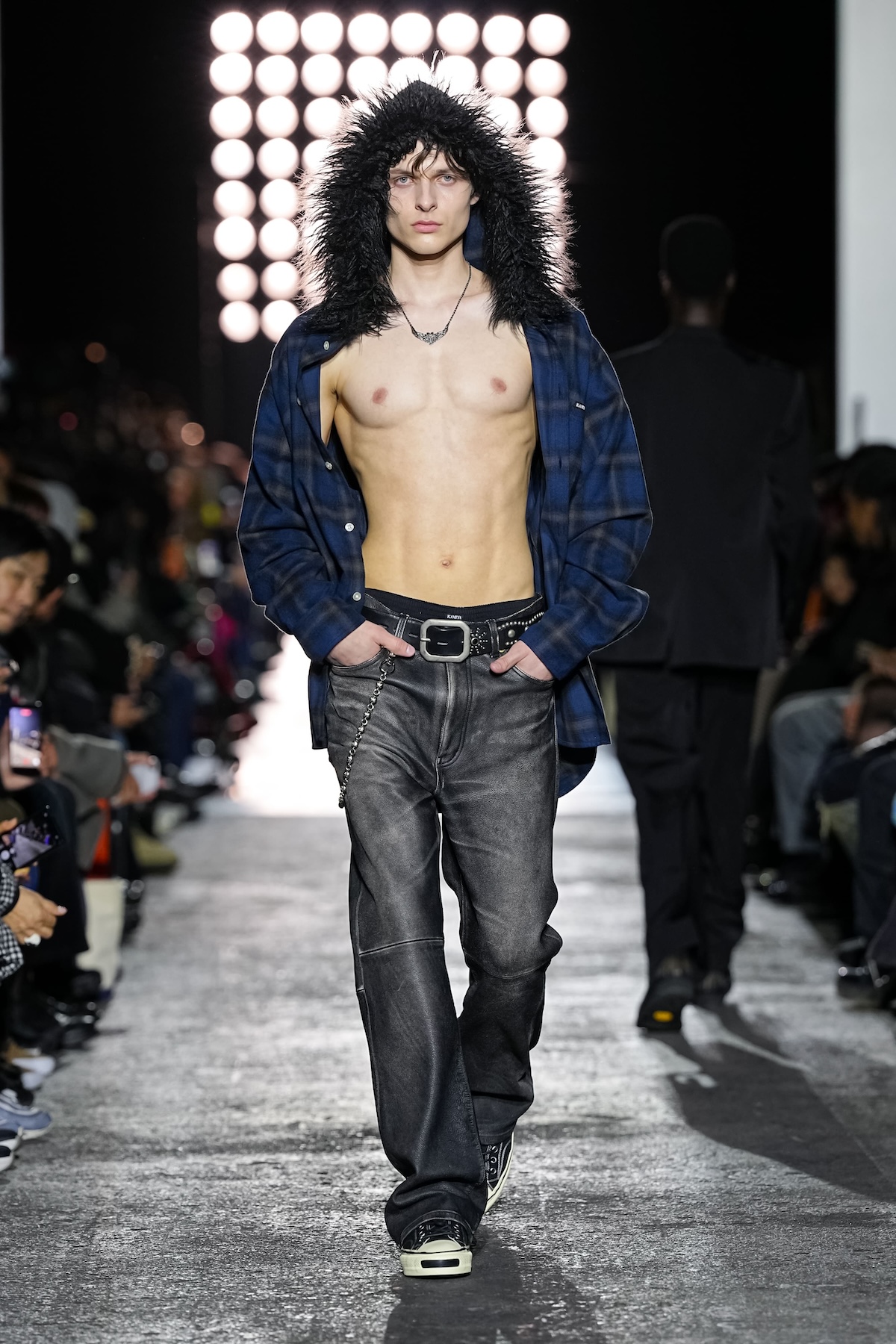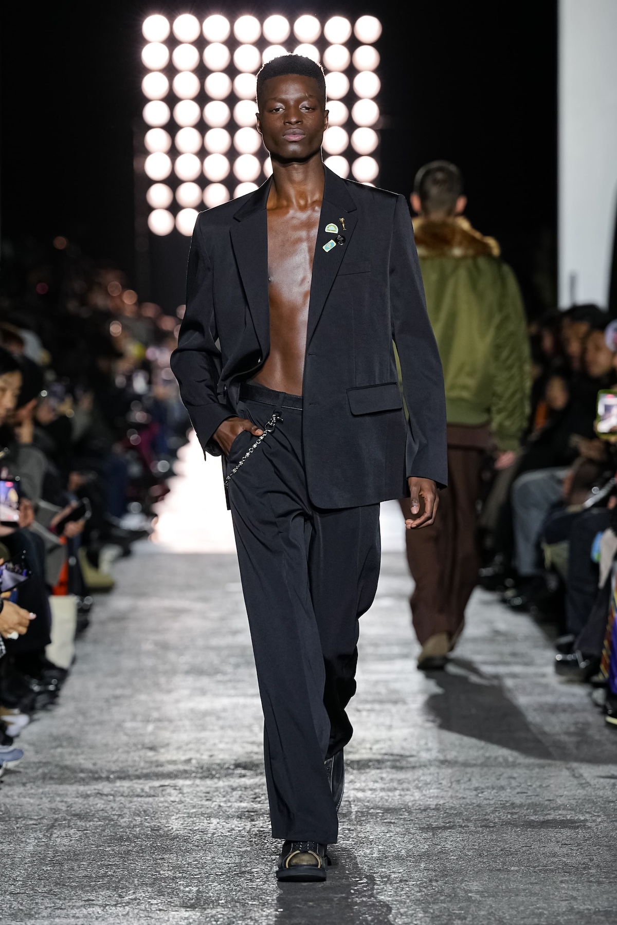 キーピースは、神谷康司デザイナーが2000年代に愛用していたというサルエルパンツを、フルレングスで再解釈し進化させたアイテム。トラウザースに仕立て、仕立ての良さがうかがえるテーラードジャケットと合わせるなど、新たなスタイリングを見せた。KAMIYAの特徴であるヴィンテージ加工のカジュアルアイテムのほか、シンプルな美しさが際立つレザーバッグ、襟元にあしらったメタル装飾、フェイクファーのロングコートなども印象的なコレクションだ。