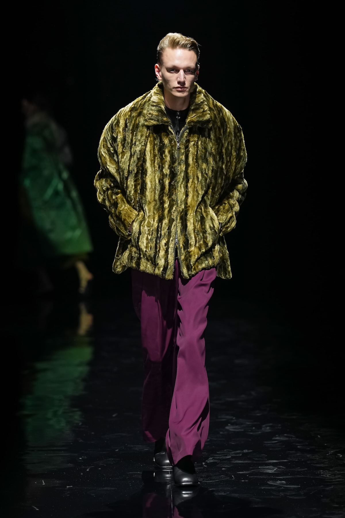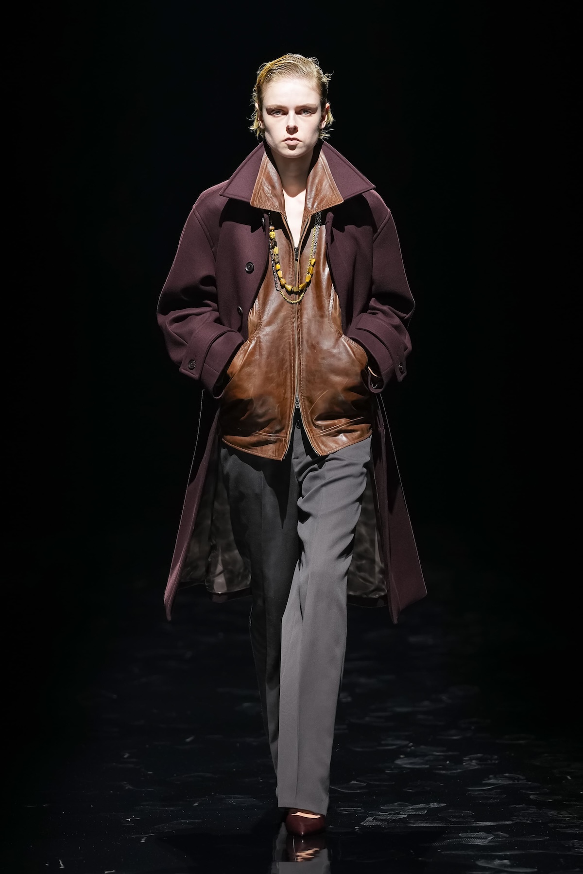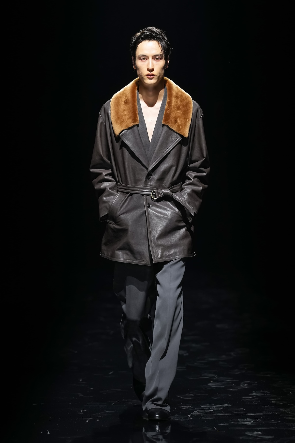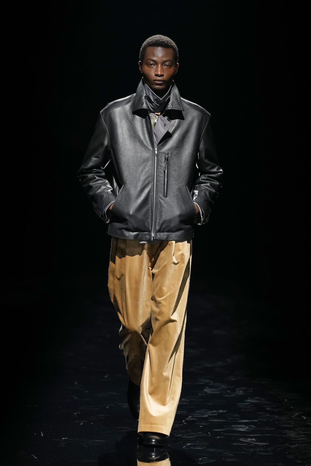 "ミクスチャー・スタイルの原点"と名付けられたNO-BRAINER PANTSをはじめ、立体的な表面が印象的なニットプルオーバー、ビーガンファーのブルゾン、ハードクラック加工を施したボアブルゾンなど、素材と表情の異なるアイテムがコレクションに豊かな奥行きをもたらした。