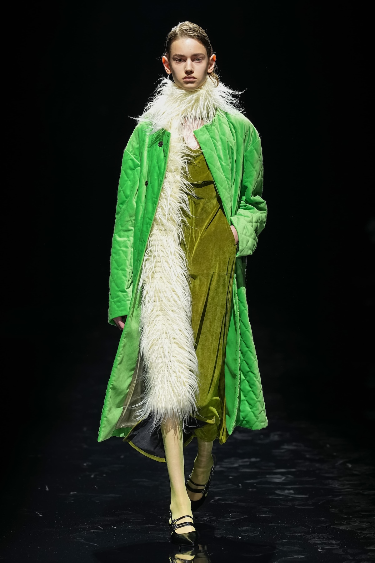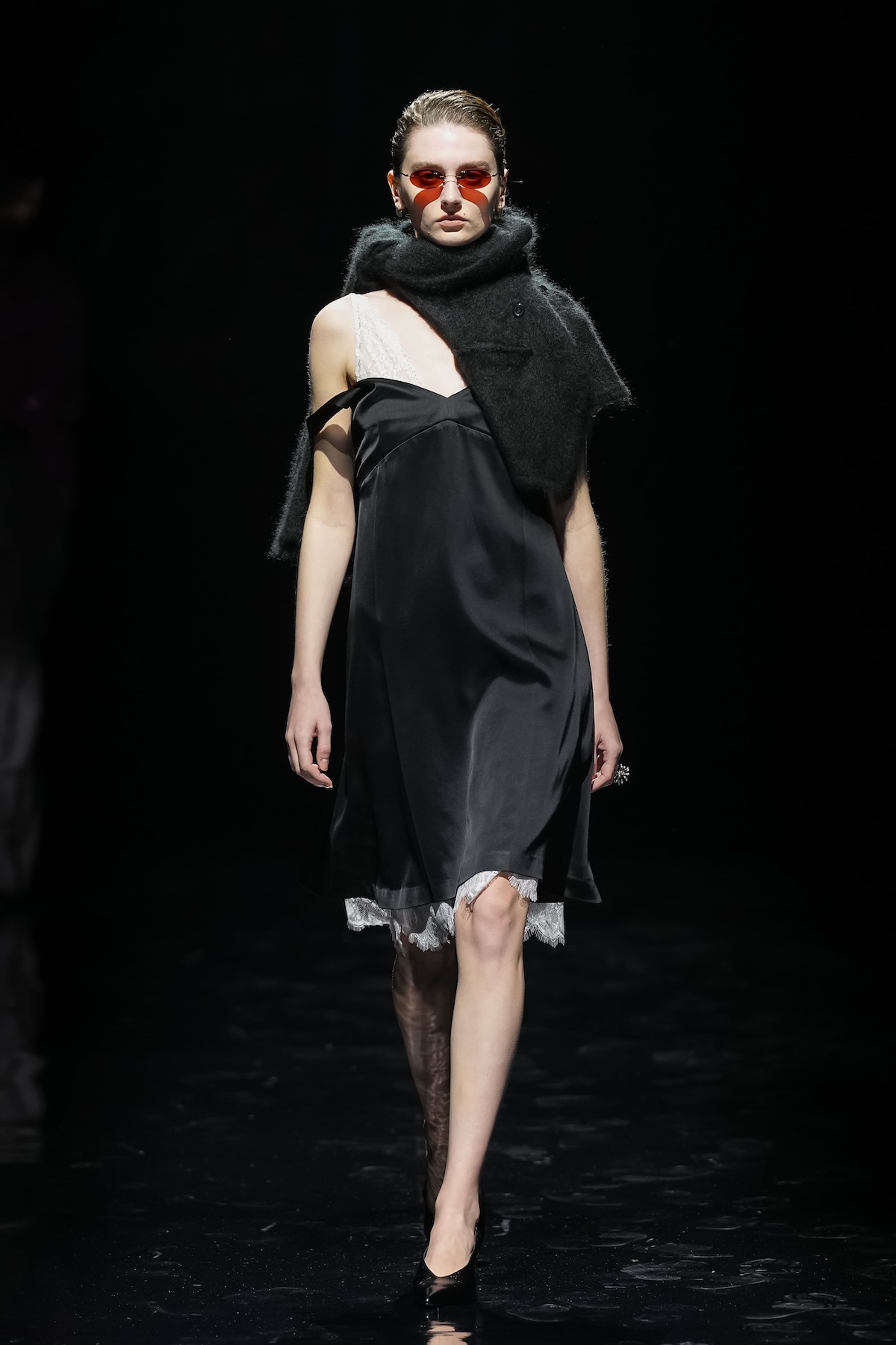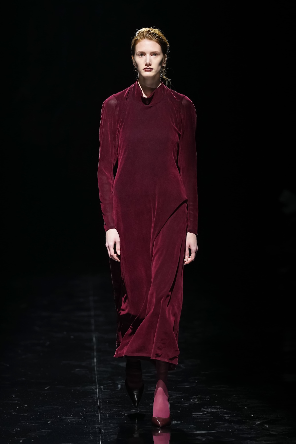 ショーを通じて印象的だったのは、その官能的な表現だ。ブラトップや膝丈フレアスカートによる肌見せ、メタリック・ラメ糸・ビーガンファーの輝き、レースや透け感、強い色柄――これらを対極にある要素と掛け合わせることで、ANTHEM Aならではの"ミクスチャー・スタイル"が完成する。
