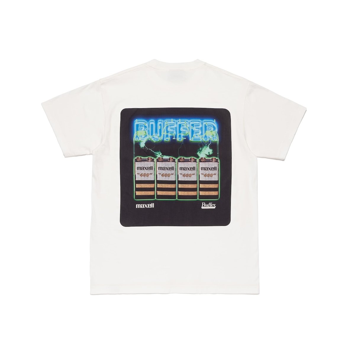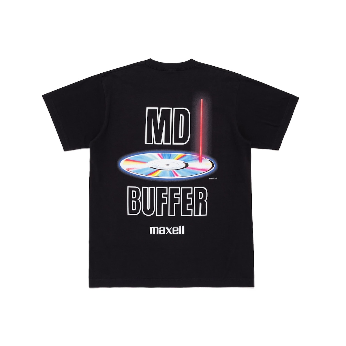 Tシャツ2型はそれぞれ白と黒のカラーで展開。1970年代の角形9V電池をモチーフに、電流がほとばしるようなエネルギッシュなグラフィックをデザインに加え、1993年発売のMaxell初代MDパッケージを着想に、デジタル化へ向かう当時の音楽文化を視覚的に落とし込んだグラフィックも登場。
