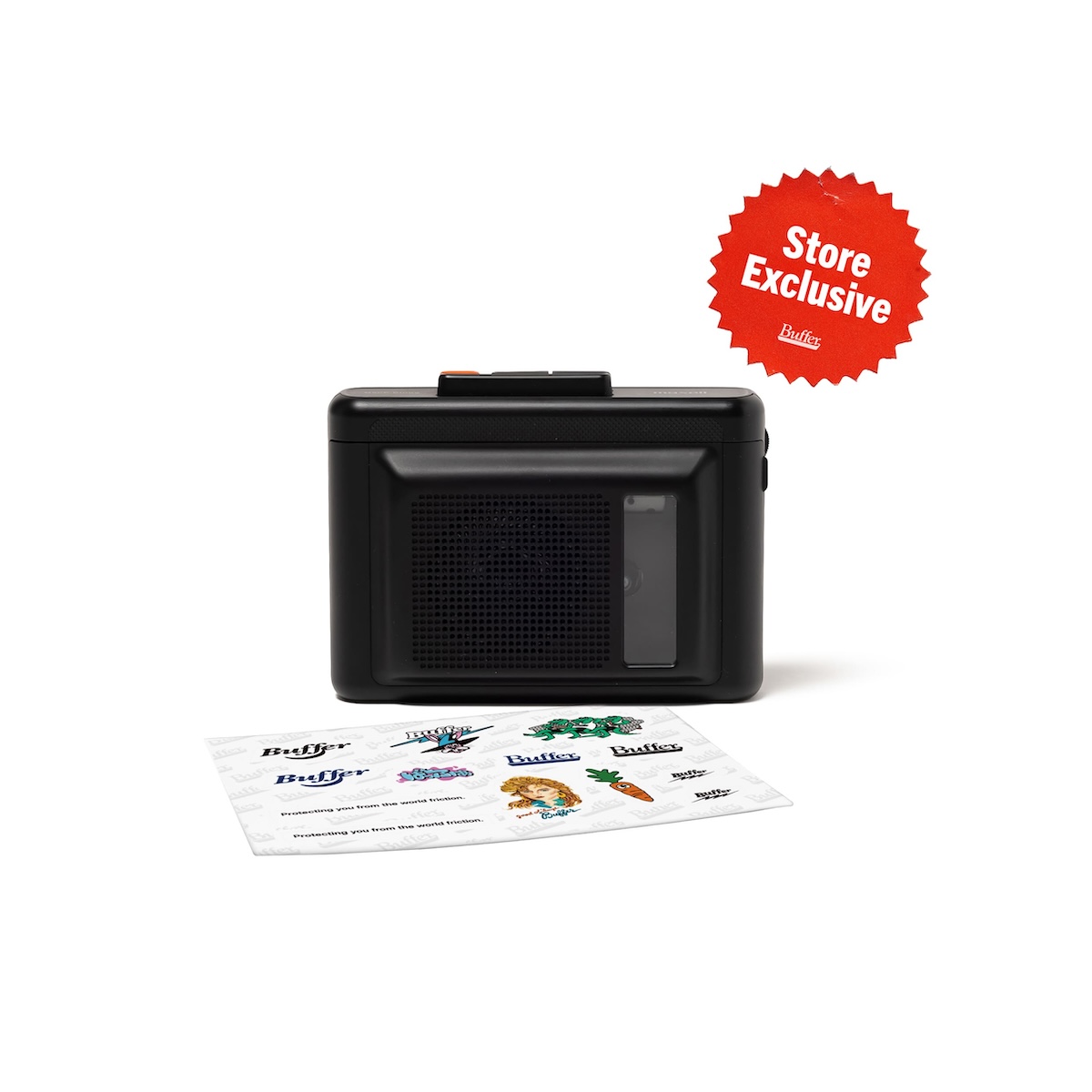 さらに、「Buffer Store」限定販売となるBluetooth®対応ポータブルカセットプレーヤー「MXCP-P100SBK」には、Bufferのオリジナルステッカーが付属。真鍮フライホイールと内蔵スピーカーを備えた、カセットならではの温かみある音を現代的な利便性とともに楽しめる本アイテムは、充電式で最大約9時間の再生が可能に。有線・ワイヤレス双方のヘッドホンにも対応する。